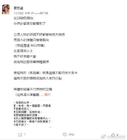 媒體的報道不代表我的立場,(從我退出演藝圈我只接受過一次采訪),而你們的留言不代表我的感受,相信沒有人會希望看到周遭的人正面臨困境而再落井下石。