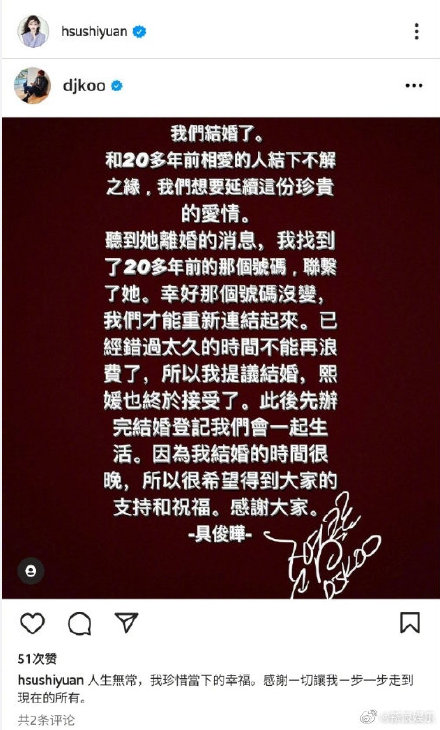 離婚后大S具俊燁再度聯(lián)系并見(jiàn)面,約定好剩下的一生將在一起。他們安靜地先完成了結(jié)婚登記,不舉辦婚禮。