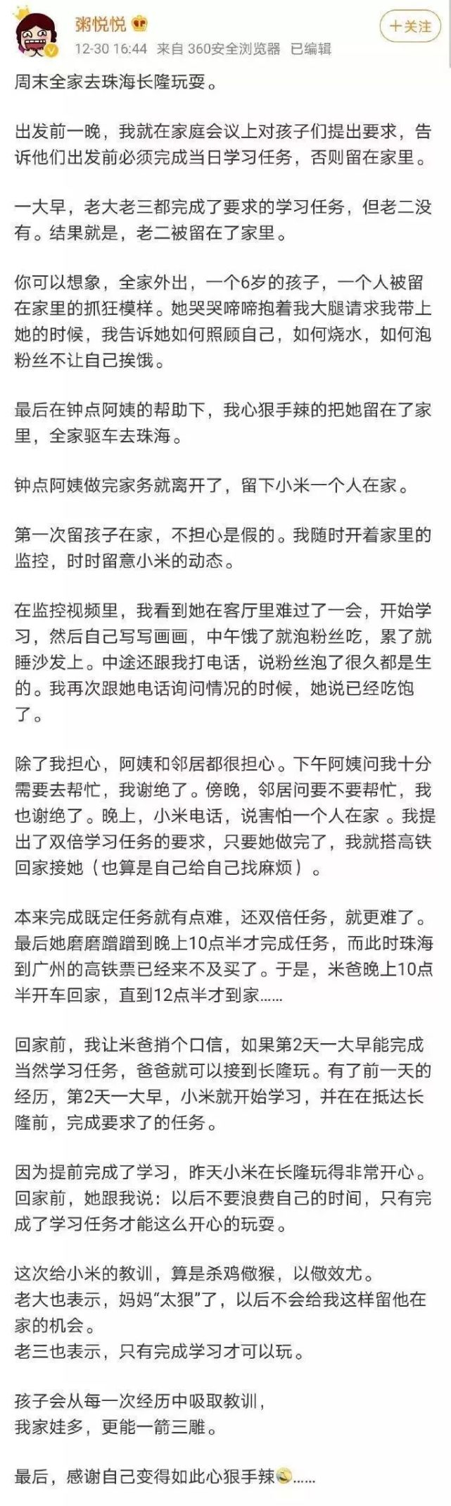 因?yàn)槎畠盒∶讻]完成自己給她布置的學(xué)習(xí)任務(wù),為了懲罰她,這位母親就做出了讓人驚掉下巴的奇葩舉動(dòng):帶著其他兩個(gè)孩子出去游玩,把6歲的小米獨(dú)自扔在家里做作業(yè),自己燒水泡粉絲吃。期間,小米多次打電話告訴她:“自己在家里過(guò)夜很害怕”、“粉絲怎么泡都泡不熟”,而這位母親是怎么反應(yīng)的呢?她提出:你必須完成雙倍的學(xué)習(xí)任務(wù),我才同意讓爸爸去接你。到這個(gè)時(shí)候了,她滿腦子想的還是只有讓孩子學(xué)習(xí)。一個(gè)6歲孩子,還不具備自立更生的能力,放她一個(gè)人在家里,磕到碰到還算小事,萬(wàn)一在燒水的過(guò)程中被開水燙到怎么辦?萬(wàn)一不小心碰到家里的燃?xì)獠遄鍪略趺崔k?她把這樣的育兒方法分享出來(lái),還覺得自己做得不錯(cuò),粉絲還一片叫好,當(dāng)做教育模板,這才是最可怕的。