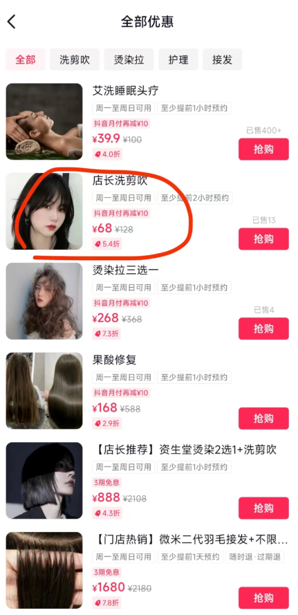 記者在某短視頻平臺上看到,這家美發(fā)沙龍商家頁面上,有不少團購優(yōu)惠選項。以陶女士購買的68元“店長洗剪吹”套餐為例,顯示已售出13份。商家頁面一共有200多條評論,大多是好評,“托尼老師非常細心”“剪得很好看,服務(wù)態(tài)度很好”……